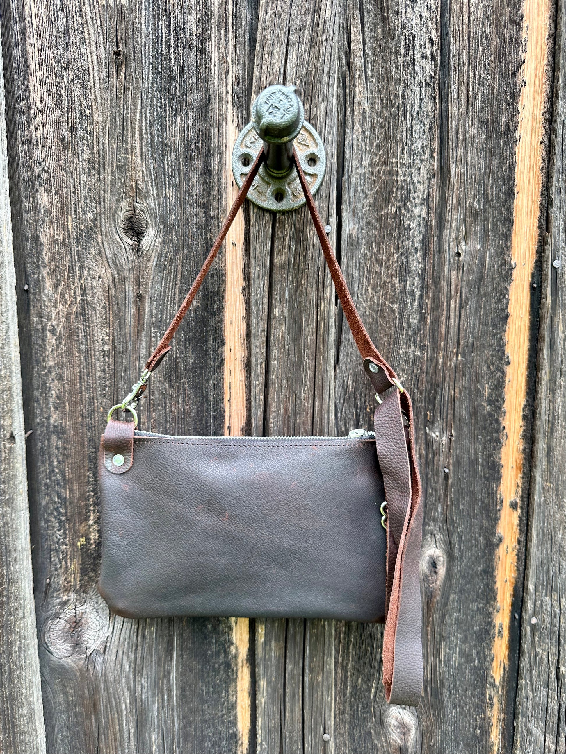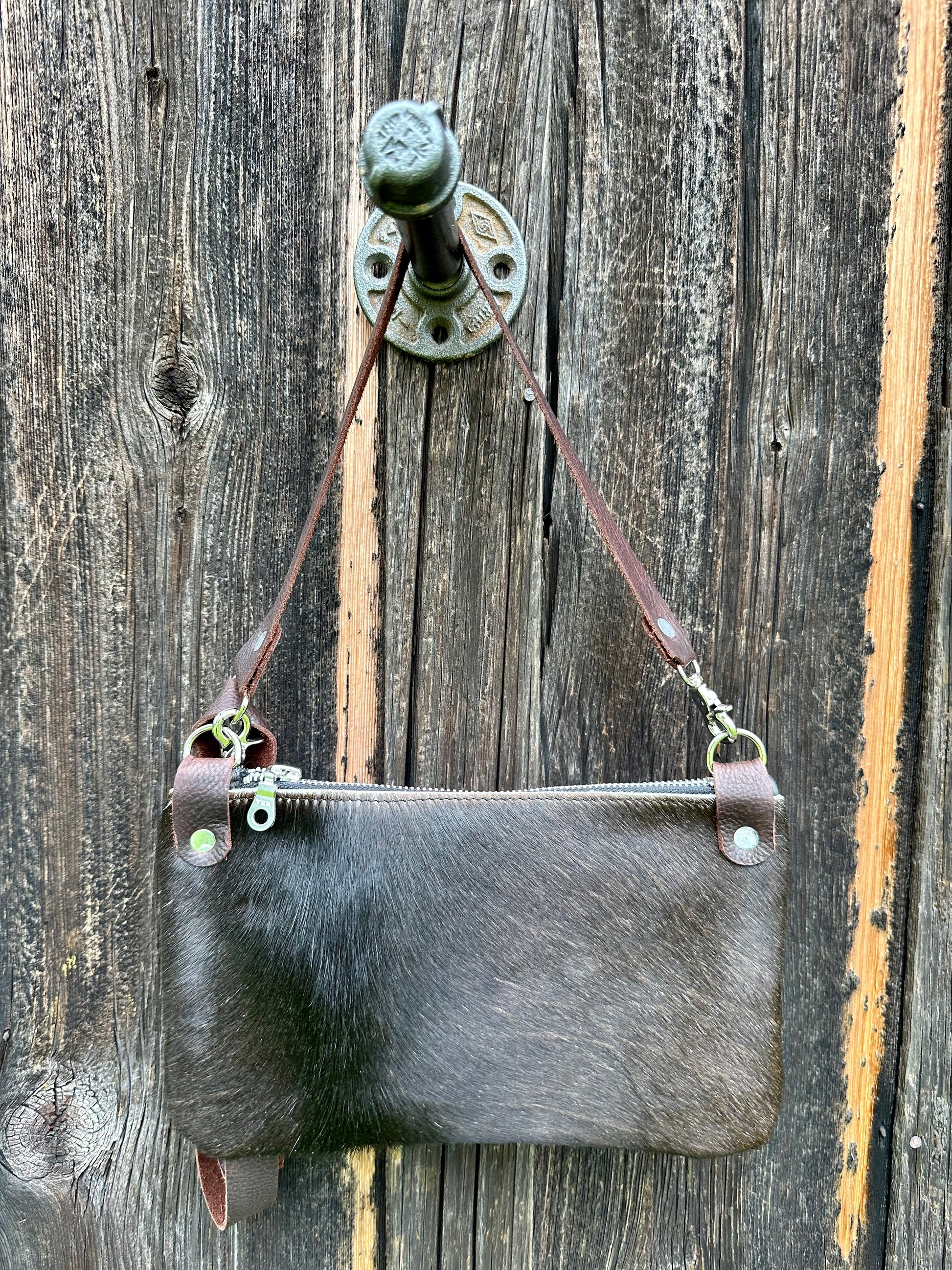 Cheyenne is a crossbody style bag with adjustable shoulder strap. This is an unlined bag made from a hair on hide on the front and a coordinating chocolate smooth leather for comfort on the opposite side. The strap is an adjustable crossbody length with a ring that allows it to be converted for shoulder use as well