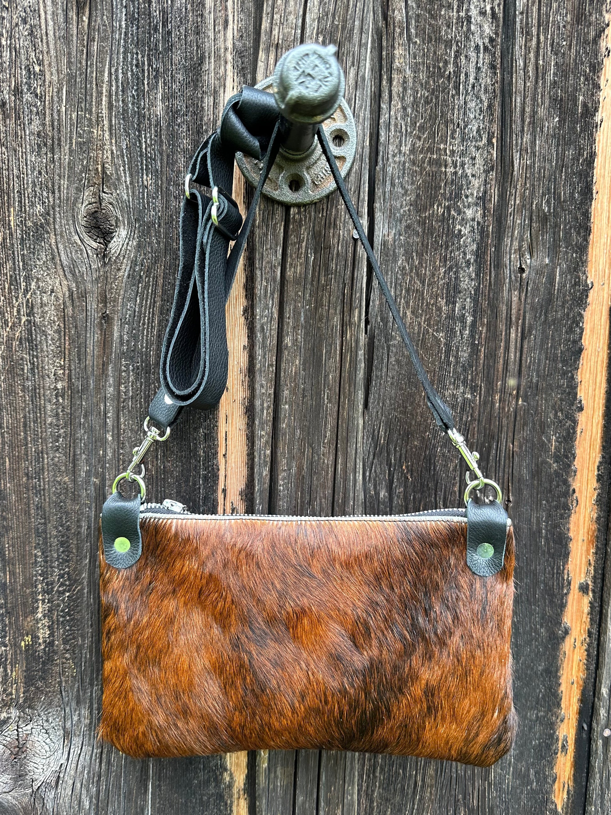 Cheyenne is a crossbody style bag with adjustable shoulder strap. This is an unlined bag made from a hair on hide on the front and a coordinating black smooth leather for comfort on the opposite side. The strap is an adjustable crossbody length with a ring that allows it to be converted for shoulder use as well